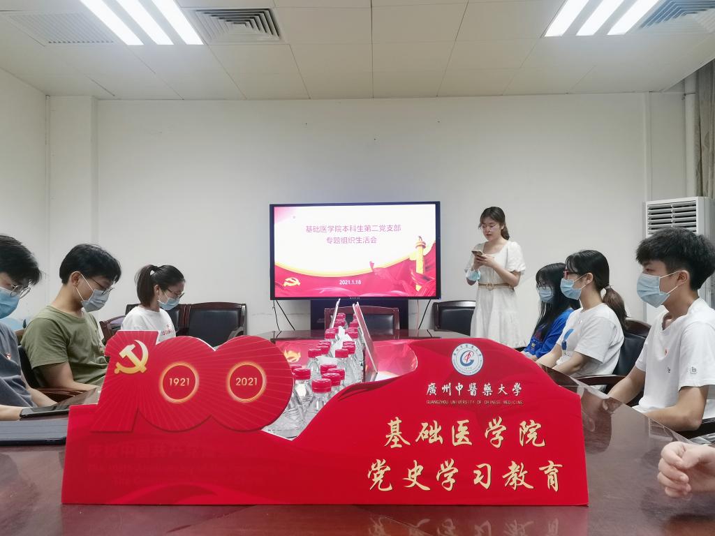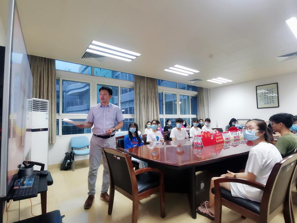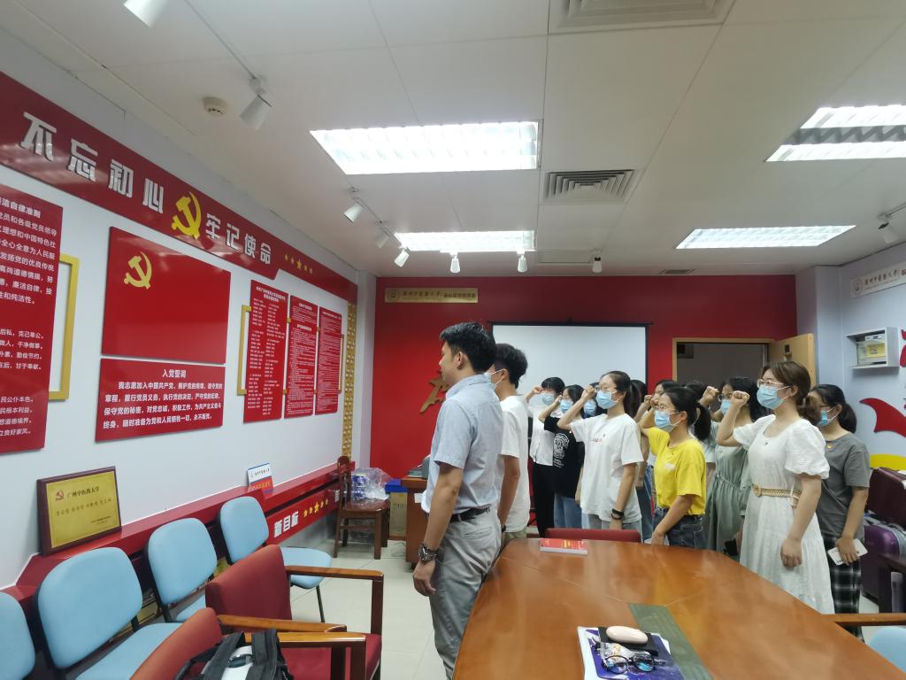 本次交流会主要包括两项议程:支部书记讲党课、重温入党誓词。会议的第一项议程为对党史的研读,邓茂鑫老师以“铭记奋斗历程,践行初心使命”为主题,从中国共产党成立的历史背景、党领导下国家所取得的成就、党员如何践行初心使命三个部分进行讲解。首先,邓茂鑫老师引入热播影视剧《觉醒年代》,带领同学们一起回顾建党的历史背景。他提到:“党的建立有三个基础:一是马克思主义在中国的广泛传播,为中国共产党的创建奠定了思想基础;二是中国工人阶级的成长和工人运动的兴起,为中国共产党的创建奠定了阶级基础;三是革命知识分子队伍和早期地方组织的形成,为中国共产党的创建奠定了组织基础。”紧接着,邓茂鑫老师从广州抗疫一线党员先锋岗、神州十二号航天员成功升空来说明在中国共产党的领导下,我国医疗卫生技术条件的提高及航天航空领域的快速发展,并指出当中凝聚的党员力量。最后,邓茂鑫老师从支部优秀党员的实例来给同学们讲述党员应该如何践行初心使命,并指出我们只有学习党的政治理论知识,了解党的历史发展背景,才能更好地提高思想觉悟,更好地践行初心使命。