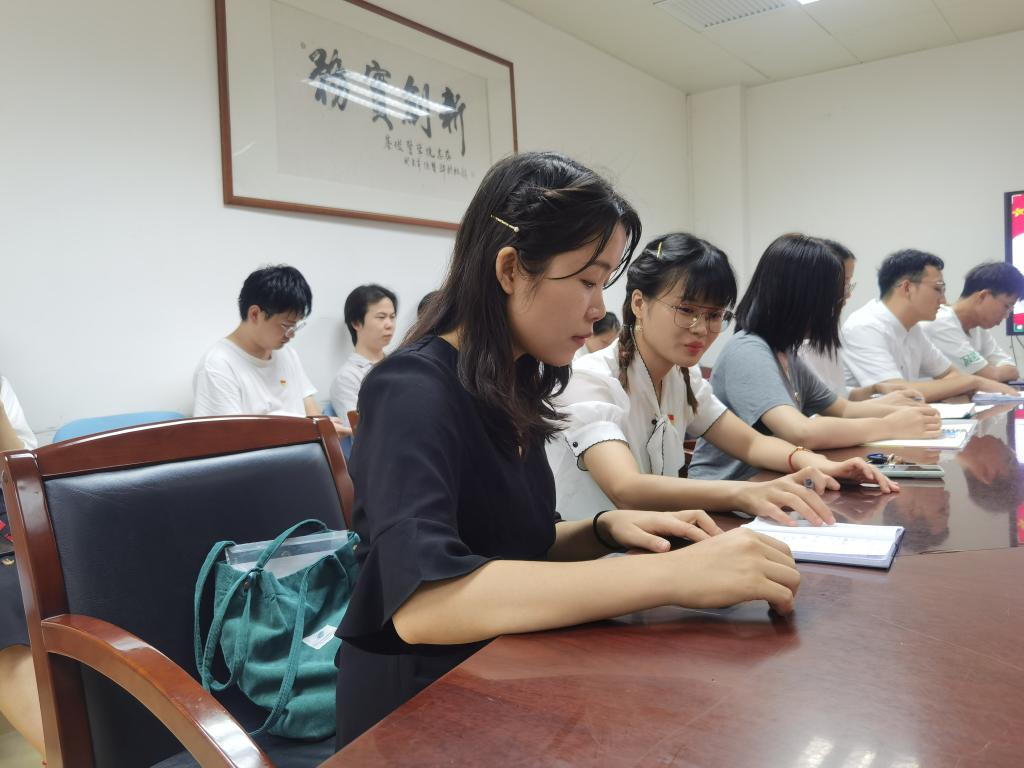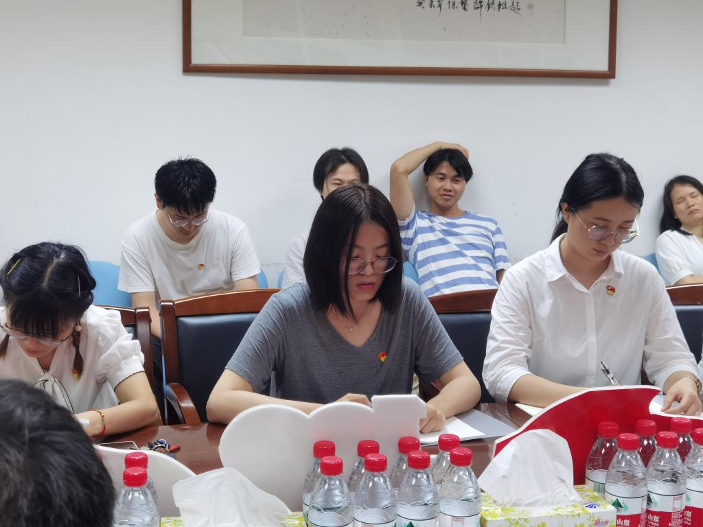 第二项议程讨论是否通过叶芃等9位预备党员的按期转正申请。预备党员依次宣读转正申请,就入党以来各自在思想政治、学习、工作等方面的进步与不足展开汇报。而后,支部书记兼组织委员姚晓玲同志逐一宣读对以上申请转正的预备党员的预备期综合考察意见,并组织与会党员结合其日常表现进行评价及表态。经无记名投票,与会12名正式党员一致同意叶芃等9名预备党员的按期转正申请。在表示祝贺的同时,姚晓玲同志强调,党员是党的肌体的细胞和党的活动的主体,而作为新时代下面临着更多挑战更大危险的青年党员,应时刻牢记入党誓言,不忘入党初心,坚定理想信念,挺起先辈们用血汗坚守住的共产党人的精神脊梁!