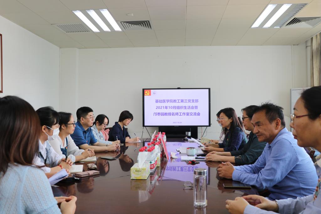 【基础讯】10月29日上午,伟德国际1946亚洲版教工第三党支部10月组织生活会暨邝枣园教授名师工作室交流会在基础楼423室举行。会议由教工第三党支部书记刘爱军主持,参加人员有教工第三党支部党员、公司青年骨干教师代表黄雅丽、刘微、张亚星、张文、张勰等。