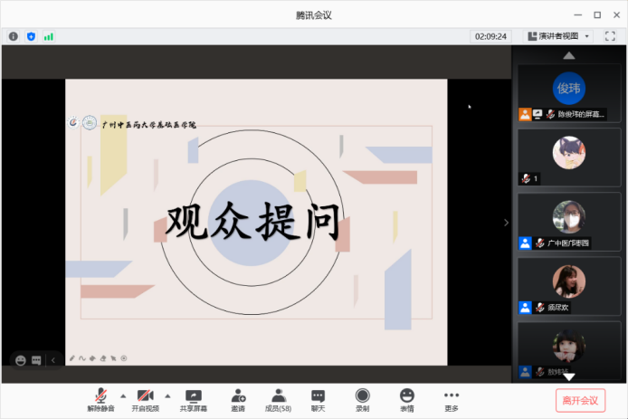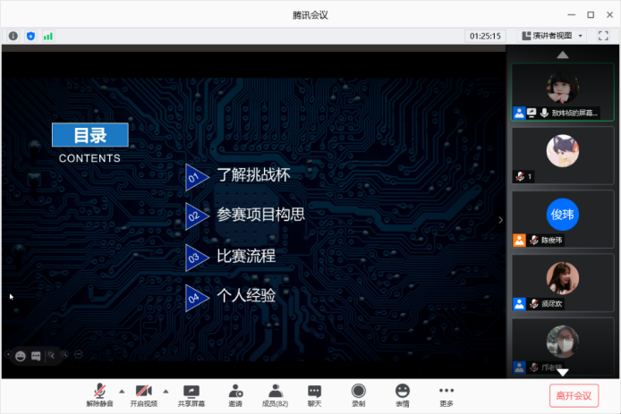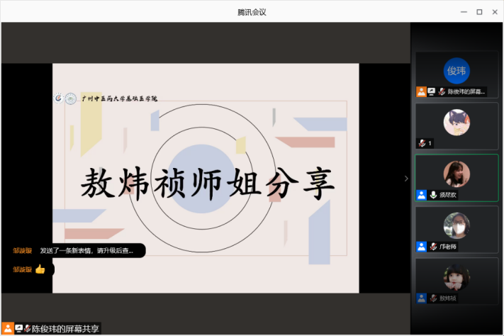 紧接着,敖玮祯同学结合自身经验与具体案例,从了解挑战杯、参赛项目构思、比赛流程、个人经验四方面为同学们详细剖析挑战杯。敖同学指出,参加挑战杯是对个人科研与团队能力的考验,建议同学们结合公司与公司特色,申请医药类项目,并鼓励同学们勇敢迈出第一步,体味科研的无限可能。