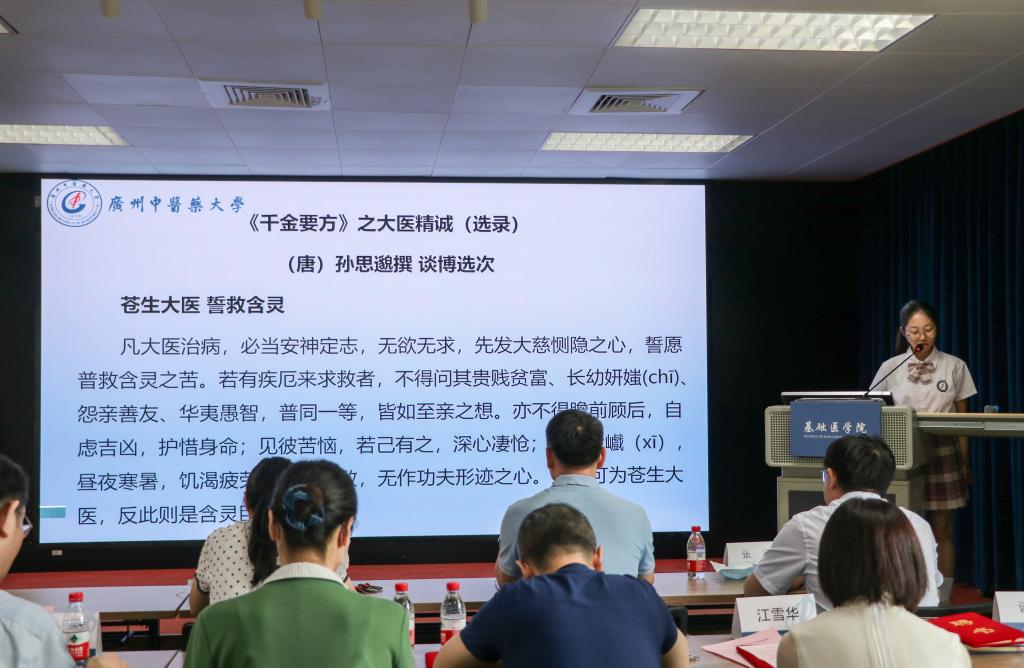 为了让员工们尽早树立正确的医德观,明确职业方向与角色,提高自身的职业素养,员工代表领读《千金要方之大医精诚》选段,师生们进行跟读。随后,举行了庄重的拜师仪式,各组导师向员工们赠送中医经典著作,希望员工能够读经典,用经典,构建中医思维;员工鞠躬回礼,表达敬意。