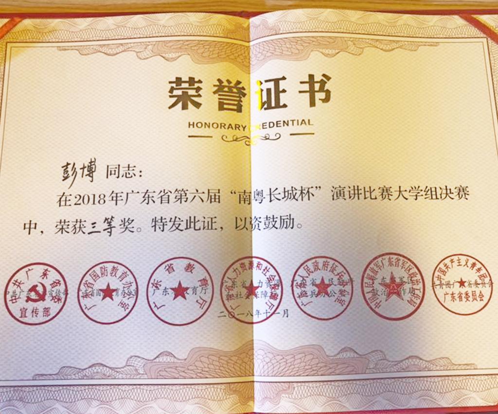 喜讯!伟德国际1946亚洲版彭博同学荣获广东省第六届“南粤长城杯”演讲比赛决赛三等奖