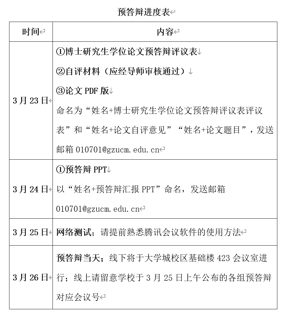 4. 博士研究生以PPT形式报告学位论文,10分钟/生;专家提问、申请人答辩环节,时间限定10分钟;预答辩PPT请在3月24日(周四)下午3:00前发送邮箱010701@gzucm.edu.cn,PPT以“姓名+预答辩汇报PPT”命名;