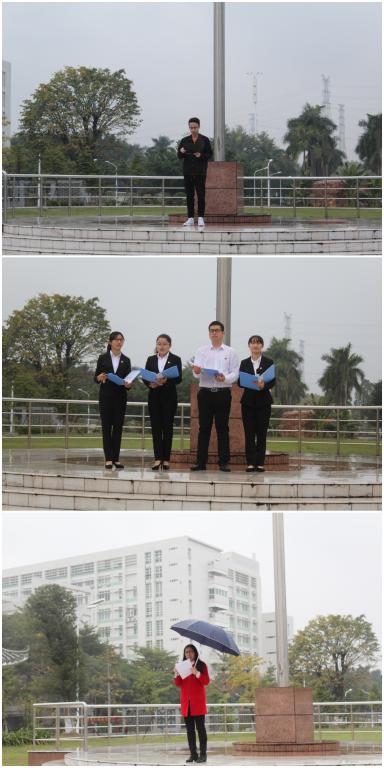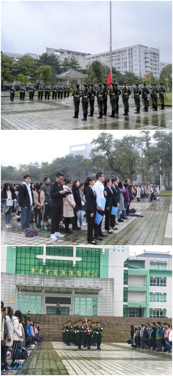 当天上午,升旗仪式风雨不改,7时20分准时开始。36名队员组成的校国旗护卫队护卫着中华人民共和国国旗,从广东中医药博物馆门前出发,持枪行进在大学城校区正门的中轴线上,在分列两侧的伟德国际1946亚洲版师生注目中,迈着坚定有力的正步走向国旗杆基座前。当雄壮的义勇军进行曲奏响时,博物馆前广场上500余名师生的目光都汇聚到冉冉升起的五星红旗上,齐唱国歌。每一张仰望的脸庞即便是迎着冰冷的风雨,但对五星红旗热爱、专注的目光始终不变。