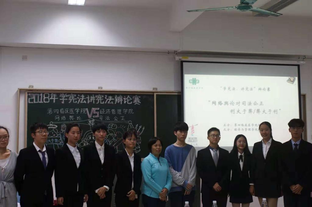 2018年11月26晚,由第四临床医公司(深创班)团学学术部主办的“学宪法,讲宪法”辩论赛在大学城校区教学楼A215举行。辅导员刘素香老师,四院、经管辩论队,各兄弟公司团学代表和观赛同学共30余人参加了活动。