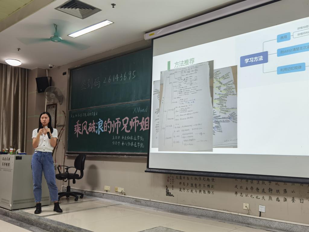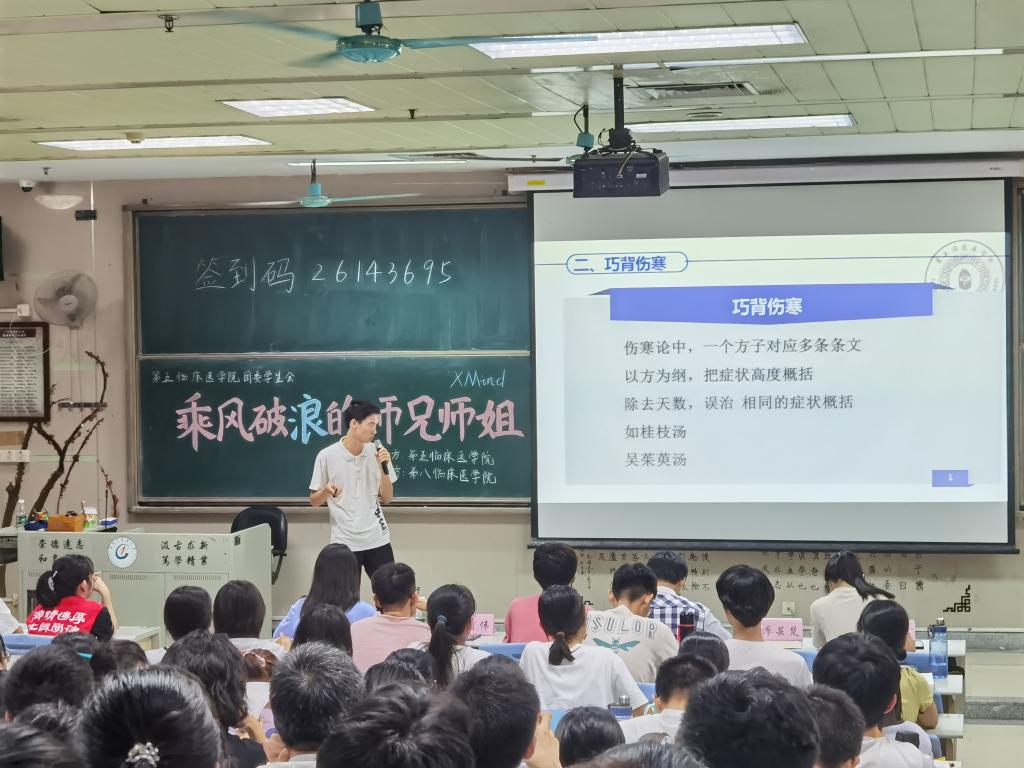 视频播放结束后,廖芸楚师姐开始学习方法的分享,就背诵的时间安排、学习任务的规划、社团与备考的劳逸结合等等方面解答了大家的疑惑。刘育伟师兄则广泛收集经验,结合自己的看法,用诙谐幽默的语言向观众展示如何巧背《黄帝内经》、《伤寒论》的条文。最后,应圆圆师姐带领大家了解五院,细致讲解五院的特色,分享见习经验,让同学们对于五院有了更加深入的了解。