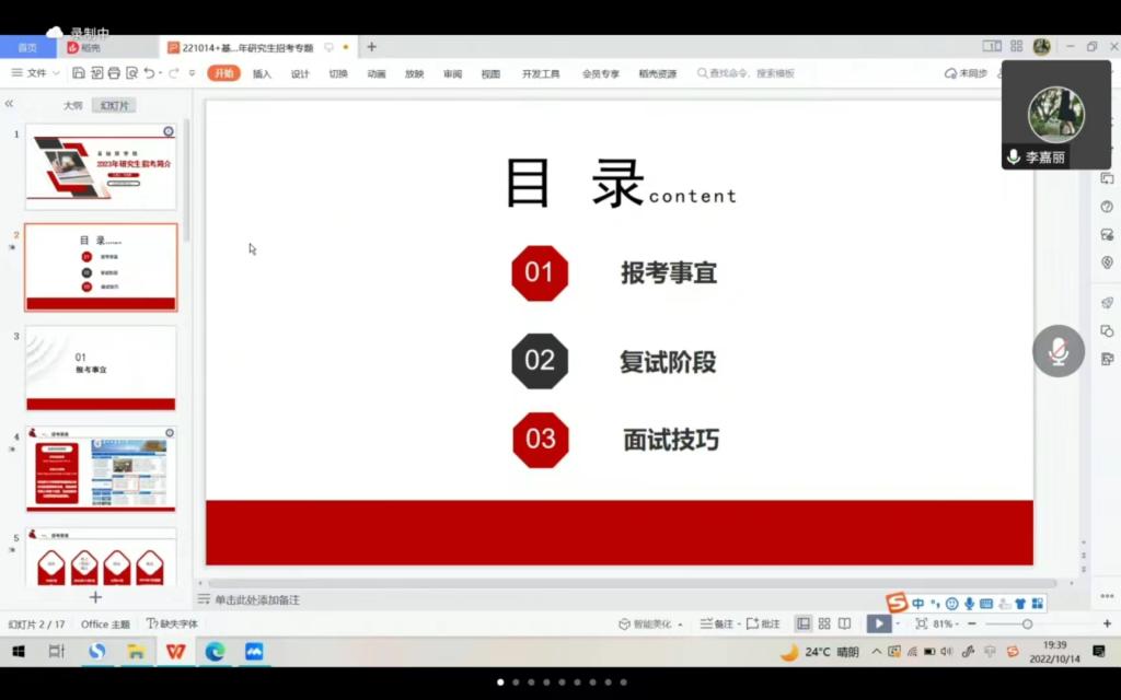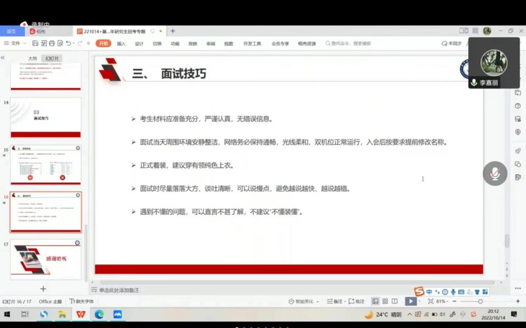 随后,李嘉丽老师以公司2023年研究生招考简介为例,从“报考事宜”“复试阶段”“面试技巧”三个方面向同学们介绍研究生报考及考试过程的注意事项。李老师指出考生获取信息要以报考院校研究生院官网为准,要关注报考院校的培养目标、培养类型、招生安排及招生条件,了解其考试方式及各项工作流程,资料一定要根据报考院校的文件要求按时按规提供,并做好充分准备;面试过程中,要着装正式,谈吐清晰,落落大方。