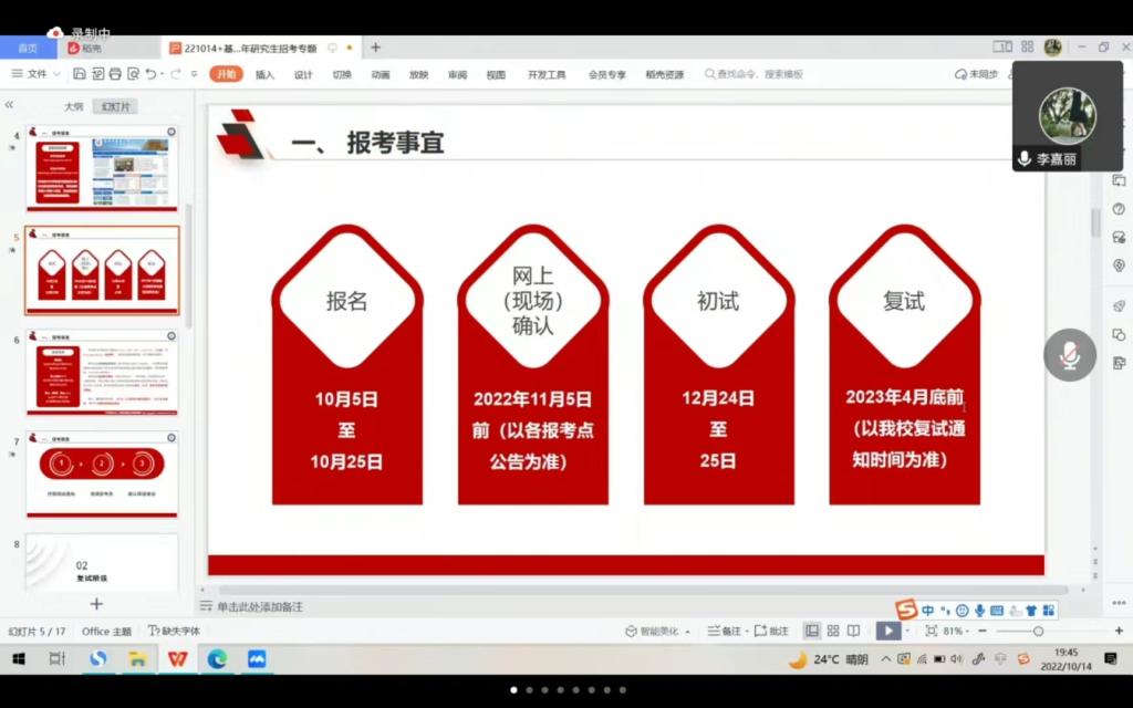 【基础讯】2022年10月14日晚上,伟德国际1946亚洲版于腾讯会议开展助力考研百日冲刺的线上专题讲座。本次讲座邀请了伟德国际1946亚洲版张韧老师、政党办公室李嘉丽老师和学工办韩娟老师,为备战考研的学子们指明方向,助其成功上岸。