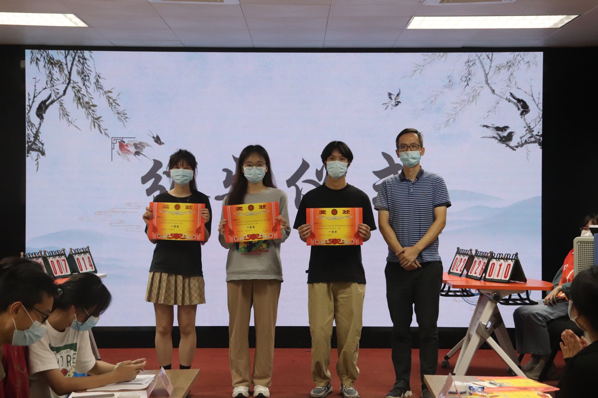 最后,评委老师对选手们的表现进行点评,讲解了选手们答错的题目,鼓励同学们多加深入钻研。经过激烈的角逐,苁蓉不迫队获得第一名,元気满满队获得第二名,劲猛6队获得第三名,其他队伍获得优秀奖,陈炜、曲卫玲老师为选手们颁发奖项。