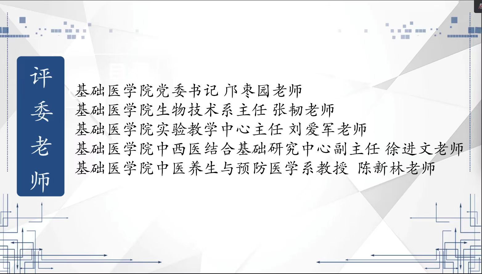 【基础讯】2022年11月27日下午13:30,伟德国际1946亚洲版第八届“启研”课题设计大赛答辩会暨闭幕式于钉钉成功举办。本次答辩会的邀请嘉宾有公司党委书记邝枣园老师、中西医结合实验平台主任张韧老师、实验教学中心主任刘爱军老师、中西医结合基础研究中心副主任徐进文老师及中医养生与预防医学系教授陈新林老师。本次大赛延续课题设计大赛精神,旨在激发同学们对科研的兴趣,发挥同学们参加科研的积极性,提高同学们科研实践与合作创新的能力。