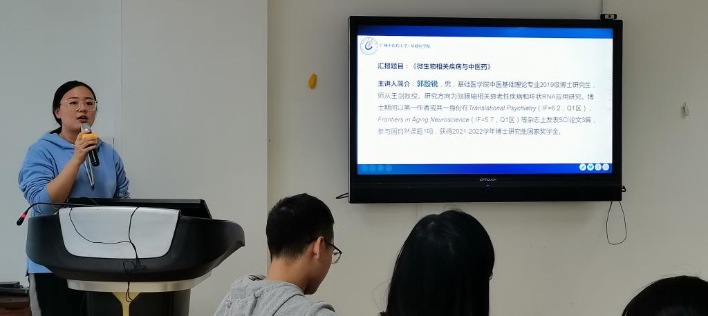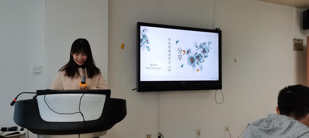 主持人简短介绍后,第一位主讲人谢铭湘硕士,开讲《网络药理学学习心得分享》。她首先介绍了网络药理学的主要内容及应用,随后分享了在网络药理学中常用好用的数据库及工具,最后分享了她的科研心得。她提到,在科研生活中要“学会学习,做个海王”,不管是什么类型的学习都应该来者不拒,努力吸收。此外,她还指出“格局打开,生活并非只有学习”,在科研不顺利时,做点自己喜欢的事情,放慢脚步调整心态。最后她祝愿大家能够开心面对生活。
