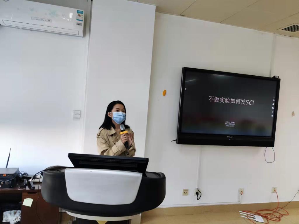 经主持人介绍后,第一位主讲人张诗静上台开讲,题目为《如何发表非实验类SCI——分享另一种科研思路》。她从文献计量分析出发,讲述了如何了解研究领域、研究团队以及研究热点趋势;然后详细介绍了Meta分析、网络药理学、生物信息学等技术手段;最后全面论述了如何发表非实验类SCI,为同学们提供了另一种科研思路。
