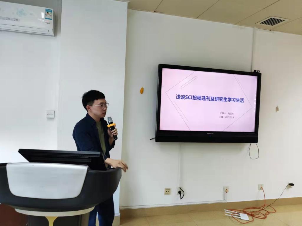 第二位主讲人陆玉林分享的题目是《浅谈SCI投稿选刊及研究生学习生活》,他首先介绍了期刊的影响因子及分区,对SCI投稿选择进行了初步分析;然后阐述了分子机制研究的五个层次,并说明了不同层次对应的SCI期刊的影响因子;随后从经验法、文献法、杂志类型、选刊工具等方面,系统地介绍了他的SCI投稿经验;最后从自己的研究生活出发,向同学们提出了4条建议:修学储能、热爱即为天赋、全力以赴、实事求是。