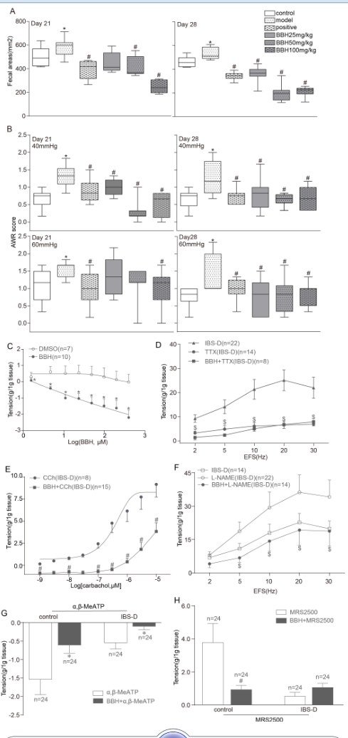 腹泻型肠易激综合征(IBS-D)是临床常见的一种功能性肠病,其主要机制与肠神经系统功能紊乱导致的内脏敏感性和平滑肌反应性异常增高有关。临床上中药能有效缓解IBS-D的症状且安全性好,然而其药理机制、药效物质尚不明确;不同的临床研究其研究对象(方、药、成份)过于分散,缺少有影响力的循证医学证据。中药黄连的活性成分小檗碱是一种苄基异喹啉生物碱,盐酸小檗碱(BBH)是小檗碱的衍生物。本研究在前期成功改良的慢性束缚应激诱导的IBS-D大鼠模型的基础上,利用分子生物学和神经药理学方法,深入研究了BBH对IBS-D大鼠结肠平滑肌神经传导的影响。结果表明,BBH可以有效降低IBS-D大鼠的排便量和腹部收缩反应程度,高剂量组(100mg/kg)优于阳性对照匹维溴铵(30mg/kg)。BBH显著抑制IBS-D大鼠结肠离体平滑肌自发性收缩,呈现剂量依赖性,EC50为25.17 μmol/L;此效应能被TTX完全阻断。BBH能拮抗卡巴胆碱对离体平滑肌的收缩效应。BBH能有效拮抗L-NAME(nNOS抑制剂)对IBS-D离体结肠平滑肌的收缩增强效应,且抑制结肠平滑肌组织nNOS mRNA表达。加入α,β-MeATP后,IBS-D大鼠结肠张力显著下降,但幅度显著低于对照组,提示IBS-D大鼠结肠P2X受体分布可能减少;BBH能几乎完全拮抗此作用,提示与P2X有较好的亲和力。加入MRS2500(P2Y1受体拮抗剂)后,IBS-D大鼠结肠张力显著上升,BBH能部分拮抗此作用,提示BBH也可能作用于IBS-D大鼠结肠P2Y1受体实现舒张作用。此外,BBH下调IBS-D大鼠结肠组织5-HT3AR mRNA的表达水平。