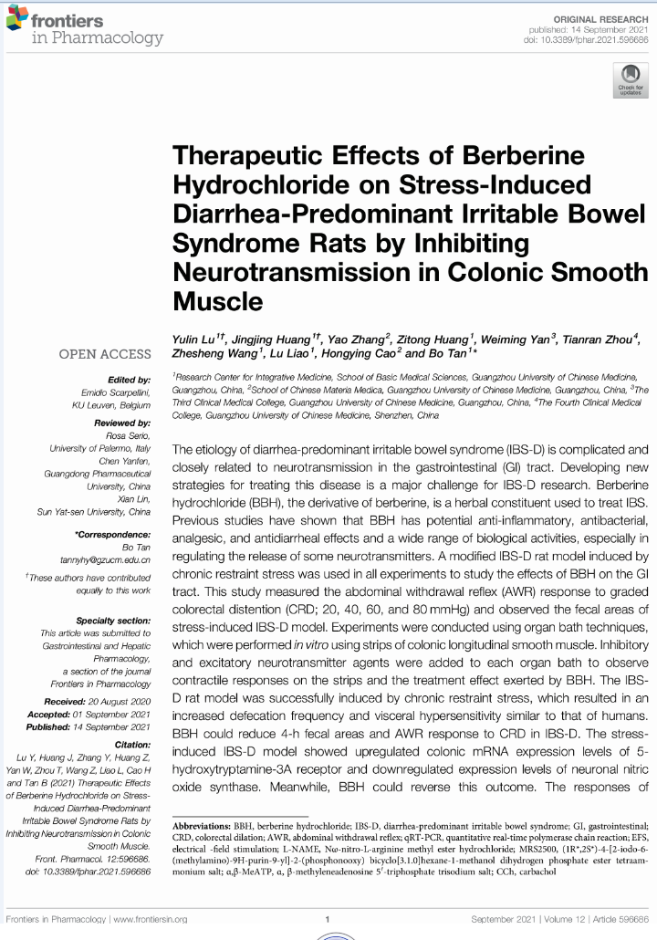 ①Lu YL, Huang JJ, Zhang Y, Huang ZT, Yan WM, Zhou TR, Wang ZS, Liao L, Cao HY, Tan B*. Therapeutic Effects of Berberine Hydrochloride on Stress-Induced Diarrhea-Predominant Irritable Bowel Syndrome Rats by Inhibiting Neurotransmission in Colonic Smooth Muscle. Front Pharmacol. 2021 Sep 14;12:596686. doi: 10.3389/fphar.2021.596686.