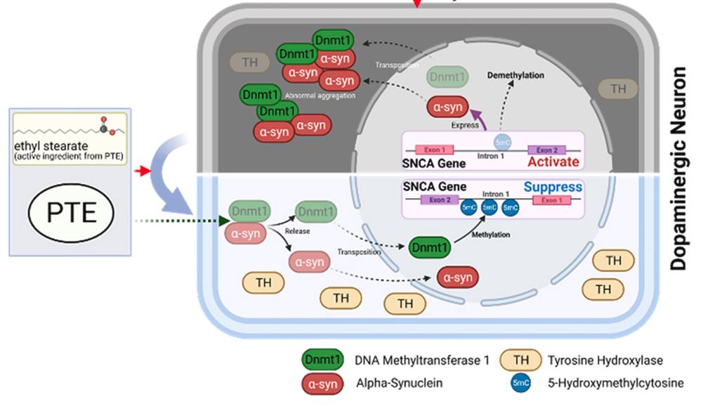帕金森病(Parkinson’s Disease, PD)作为一种高发的神经退行性疾病,其发病率往往随着年龄增长而增加。当前,关于PD的病因仍未被完全阐明,但许多研究均指向了α-突触核蛋白(α-synuclein, α-Syn)可在多巴胺能神经元内发生异常聚集与堆积,并最终导致多巴胺能神经元功能障碍,使其无法正常合成及分泌多巴胺。此外,也有研究者发现,在神经元中异常积累的α-Syn可以通过扣留DNA甲基转移酶1(DNMT1),使α-Syn 的基因Snca内含子1区甲基化水平下降,进而引起α-Syn累积的恶性循环。