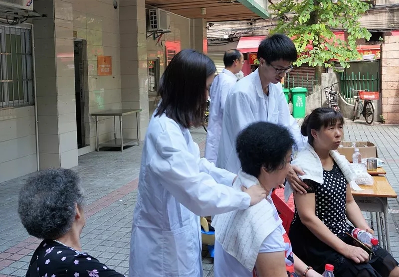 义诊当天,张壮涛老师在详细了解病情的基础上,因人施策地使用小针刀或针灸为居民缓解身体肌肉长期劳损的酸胀病痛。研究生们根据居民的性别、年龄及身体情况进行了拔火罐、贴耳穴、推拿等不同的中医诊疗服务。本科生们则为居民提供量血压、个人情况登记等服务。居民们在接受完治疗后皆表示腰痛与肩痛等慢性疼痛症状有所缓解,为广中医师生的义诊服务点赞。