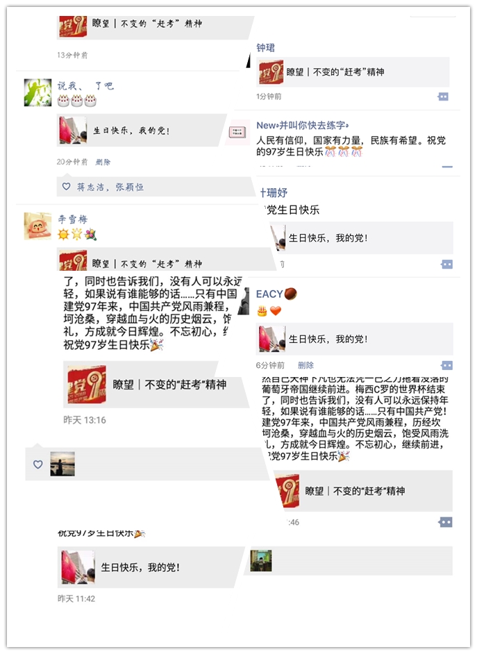 7月1日,组织各员工党支部开展线上庆祝党的97岁生日活动。员工党员、发展对象、积极分子共95人集中在朋友圈转发《瞭望》新闻周刊《不变的“赶考”精神》或《人民日报》的《生日快乐,我的党》两篇专题报道,并附上自己对党想说的心里话、祝福语。