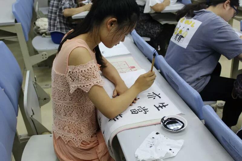 本次决赛分为毛笔、硬笔书法两组,17位决赛选手根据个人喜好选择历代名人“正能量”的五言绝句、七言律诗、词作为参赛内容。比赛现场,各参赛同学全神贯注,手腕时而上抬,时而下压,轻盈处,灵动飘逸,凝重处,力透笔尖,气势浑厚。评委老师一一为参赛同学进行指导评价。
