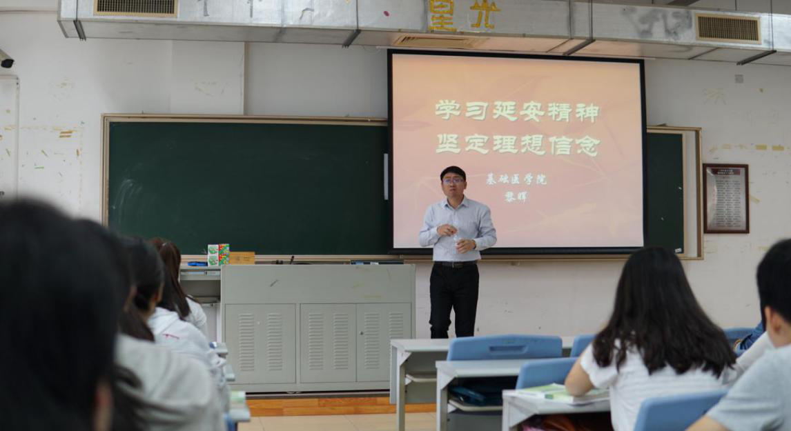 2018年3月30日上午,公司黎晖经理在大学城校区教学楼A412为16级医学检验技术专业的同学们以《学习延安精神,坚定理想信念》为主题讲授春季学期思政第一课。公司学工办主任李欢、兼职辅导员胡佳乐及员工共60余人聆听授课。