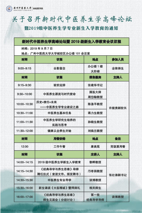 新时代中医养生学专业高峰论坛暨2019级中医养生学专业新生入学教育将于明天举行!