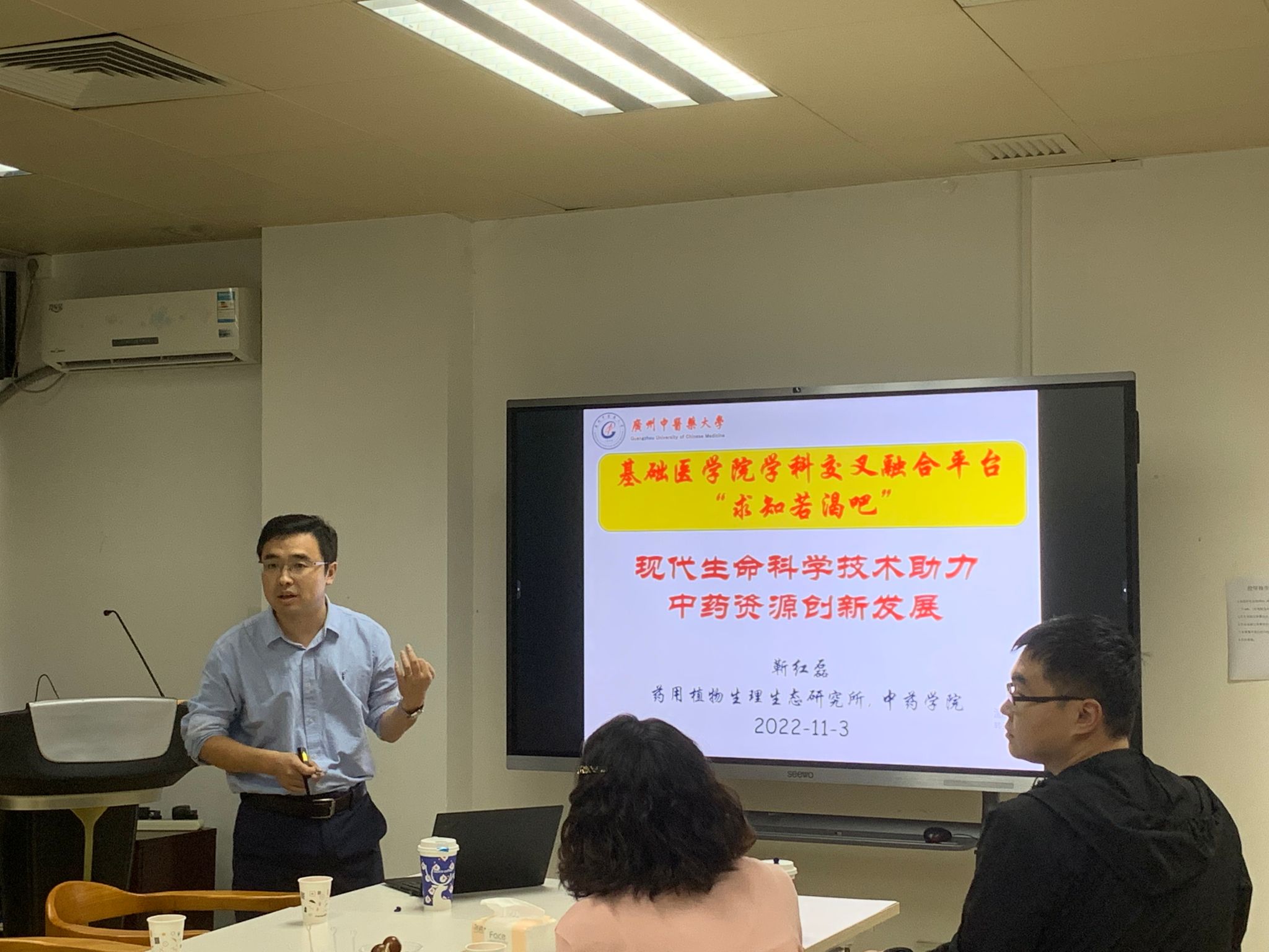 下午三点,座谈会正式开始,骆欢欢副经理对靳红磊教授进行了介绍,靳红磊教授是“广东特支计划”科技创新青年拔尖人才,现任伟德国际victor1946药用植物生理生态研究所所长,兼任广东省植物生理学会常务理事、植物生理学报责任编委。主要从事植物光合生理及中药资源相关研究。截至目前主持有有国家自然科学基金3项,中国博士后科学基金2项,广东省自然科学基金1项,研究成果发表于Plant Cell, Cell Reports, PNAS等国际顶尖期刊。