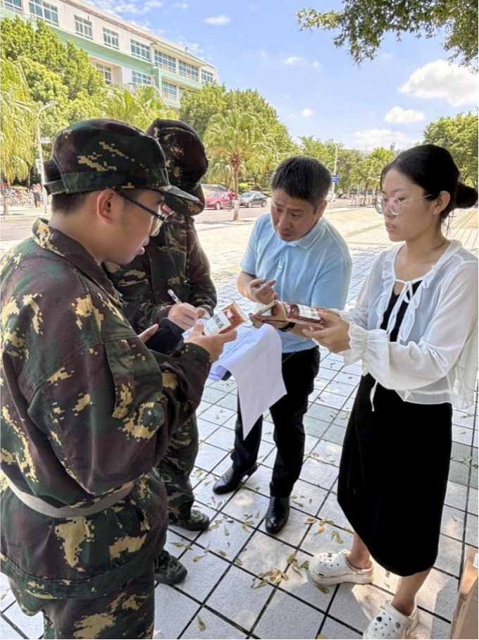 在茶饮派送过程中,现场的老师及工作人员引导新生有序领取茶饮,并为有疑问的新生解答相关问题,提供相关体质调养建议,并提醒饮用注意事项。