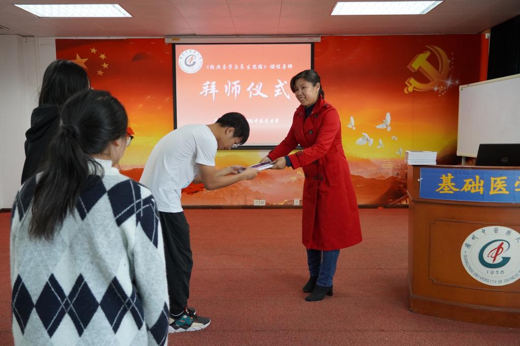 拜师仪式安排有拜师和增书两个环节。每一小组的同学上台向导师行拜师礼,导师回礼并赠予同学精心挑选的中医经典书籍。